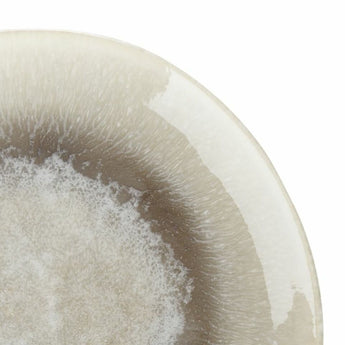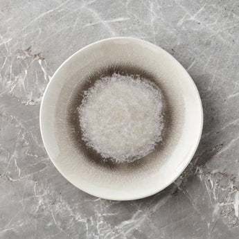 La forma sencilla y clásica de nuestro plato de ensalada Caspian pone el foco de atención en su hermoso esmalte reactivo gris. Sometido a cambios químicos durante la cocción, el vidriado produce patrones únicos y luminosos, de colores grises cálidos variables con subtonos taupe . A medida que cae en cascada por el plato, el vidriado pasa de claro a oscuro, salpicado en todo momento de marcas y cuarteados únicos. Este cuarteado intencionado y deseable se produce durante la cocción, y la craqueladura puede desarrollar más complejidad con el paso de los años, cada vez que las materias primas naturales se expanden y contraen. El vidriado y sus efectos son seguros para los alimentos, pero pueden decolorarse temporalmente con ciertos alimentos.