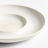 Nuestra colección Mezze, que toma su nombre del estilo mediterráneo de comidas comunitarias en pequeños platos, está diseñada para un entretenimiento informal y sin complicaciones. Diseñada como una forma de servir pan y aceite de oliva en una sola pieza, la fuente presenta un borde ancho para sujetar trozos de baguette rasgada y un cuenco central bajo para mojar el aceite. Utilice la superficie acanalada central para aromatizar el aceite con dientes de ajo frotados o corteza de limón. Cada fuente de cerámica está acabada a mano con un esmalte reactivo blanquecino que variará ligeramente y hará que cada pieza sea única.