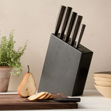 La mezcla de materiales da lugar a un elegante juego de cuchillos en bloque que encaja a la perfección en las cocinas contemporáneas. Totalmente fabricados en acero inoxidable, los cuchillos cuentan con hojas forjadas de acero inoxidable. Con un diseño limpio y minimalista, este juego de siete piezas incluye un cuchillo de pan de 8 pulgadas, un cuchillo de chef de 8 pulgadas, un cuchillo santoku de 7 pulgadas, un cuchillo multiusos dentado de 5 pulgadas y un cuchillo de pelar de 4 pulgadas. Los seis cuchillos caben en el esbelto bloque de madera negra de ángulo dinámico que ocupa sólo una pizca del preciado espacio de la encimera.