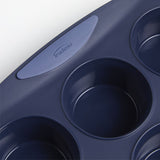 Magdalenas de maíz, magdalenas de limón y mini frittatas salen disparadas de este molde de silicona para magdalenas. Fabricado con silicona flexible, el molde hornea uniformemente y libera los productos horneados a la perfección. El borde de acero integrado mantiene el molde estable mientras lo introduce y lo saca del horno. Dotado de robustas asas, este molde de color azul intenso hornea una docena de delicias y se limpia fácilmente en el lavavajillas.