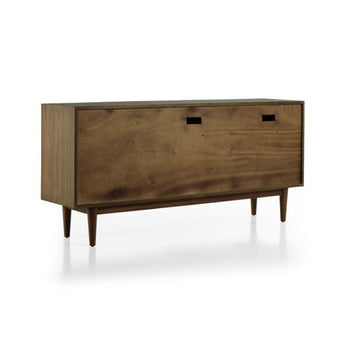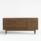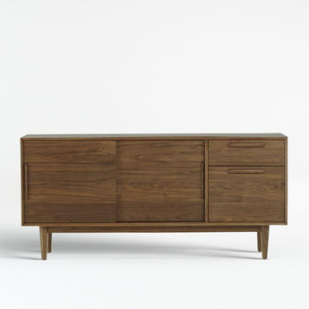 Our 1960s-inspired Tate credenza recalls the timelessness of mid-century design with a tailored profile and streamlined shape that works well in any room. Doubling as a media console, the credenza offers plenty of storage space on shelves behind smoothly sliding drawers, while the drawers accommodate everything from remotes to files to table linens. ^ Crafted of solid walnut and walnut veneer, this multipurpose piece epitomizes the clean, architectural lines of modern design. Slim, conical legs taper slightly, elegantly elevating the credenza's seamless door and drawer fronts. Linear undercut pulls add horizontal counterpoint to Tate's beautiful proportions. Designed by Blake Tovin, the Tate Walnut 64.5" Credenza/Media Console is a Crate and Barrel exclusive.