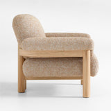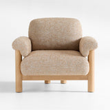 Luxuriate in the embrace of our Lisant accent chair. Expressing the essence of Brazilian modernist design, the chair indulges with plush, oversized forms. The bold solid oak frame wraps around the back, securing inset rear legs that anchor the chair's mold-breaking silhouette. Generously proportioned cushions spill over the armrest and extend beyond the frame to create a deep-seated, relaxing haven. The off-white fabric furnishes cozy texture as well as a touch of flea-market charm thanks to the captivating grid pattern created by two-toned yarn.