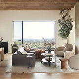 Sophisticated and current, our update to the barrel chair surrounds with comforting curves. Our take on this timeless style accentuates the rounded silhouette with padded channeling that flows in one continuous curve from arm to back to base and back again. Upholstered in a textured boucle in a light beige color, the tight-cushioned chair offers a substantial seat and low-profile, wrap-around back. The recessed swivel base provides a peek of wood grain finished in light barley brown. Alone or as a pair, our exclusive Medoc swivel chair puts a modern spin on a classic design.