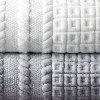 Quilted with a geometric jacquard pattern, our Doret quilt in classic white layers the bed with modern texture. The jersey quilt is backed with cotton sheeting and tailored with piping.