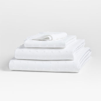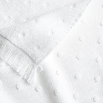 Our double-faced Dotty bath sheet is the best of both worlds. One side offers a softly textured dot design that reverses to plush terry. Made of organic cotton, the white towel is soft and absorbent. Fringe at both ends adds a fillip of fun. Part of our charming Dotty bath collection, the bath sheet is a Crate & Barrel exclusive.