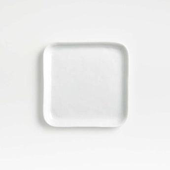 Contemporary porcelain whiteware represents a fusion of refinement and rusticity. The slim profile of this square appetizer plate takes on organic overtones with freeform rims and a finely "hammered" surface that ripples the light. Smooth enough to not harm tables, the unglazed ceramic bottom gives each piece an artisanal look.