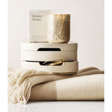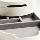 Our modern, minimalist storage box keeps your jewelry collection organized and accessible. Constructed of wood with a cream lacquer finish, the case boasts clean curves for a fresh look. Eight compartments lined in soft grey velvet provide spots for your rings, earrings, bracelets, cufflinks, watches and more. Fitted with a mirror in its lid, the box also serves as a compact getting-ready station—or use the removable tray drawer to stage the pieces you plan to wear together. Our medium jewelry box is a Crate & Barrel exclusive.