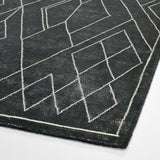 Intricate trelliswork weaves its way across Ruell, the fine white lines contrasting with the rug's countless shades of black. The geometric pattern creates a trompe l'oeil feeling of dimension, while the artfully distressed finish gives the black-and-white rug the look of a treasured heirloom. With its low, no-pile profile, the pure wool rug has a presence both effortless and refined. Designed by Mariella Ienna, our Ruell black rug is a Crate and Barrel exclusive.