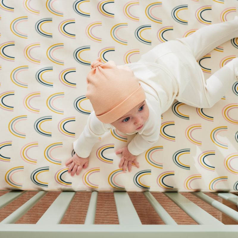 If ROYGBIV had a cool, trendy cousin, we imagine they'd be alot like our Asha bedding. It's everything we love about rainbows (see: happy, hopeful and energizing) but reimagined with modern-goes-boho vibes. This organic cotton crib fitted sheet's allover pattern features itsy-bitsy rainbows colored in with softer hues like lilac, rose, teal, indigo and golden yellow. We can't promise pots of gold, but we'd bet on lots of sweet dreams.