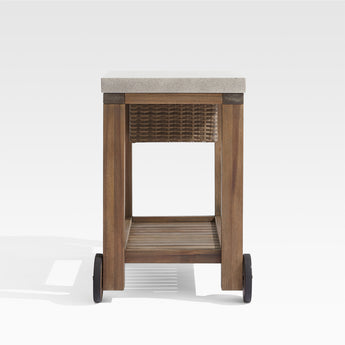 Indoor style travels outdoors with our Abaco bar cart. Exhibiting the Abaco collection's distinctive mix of concrete and natural wood, the bar cart rolls into action to keep iced drinks and cocktails within easy reach. Acacia wood creates the linear frame with blocky legs and a slatted storage shelf. The top is outfitted with a slab made of a concrete-resin for a durable work surface as well as a recessed wicker ice bucket with metal liner to keep drinks cold. A pair of wood-accented wheels add mobility and a dapper touch. Kiln-drying and a hand-applied oil finish help protect our exclusive Abaco bar cart from the elements and increase its resistance to cracking.