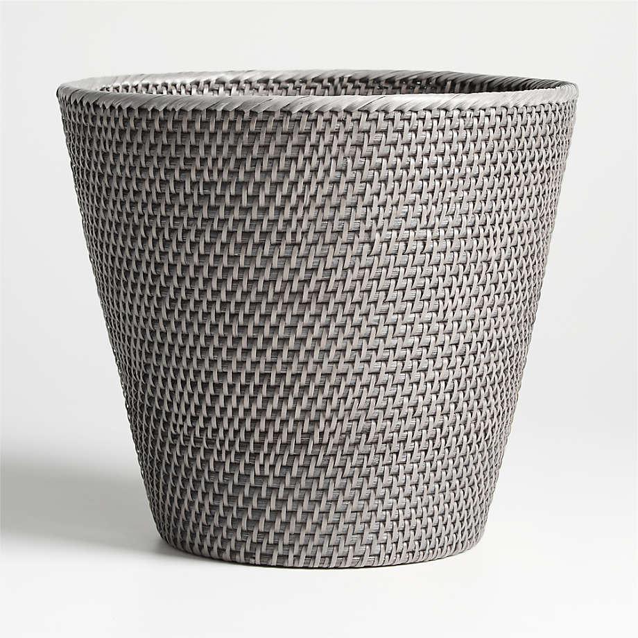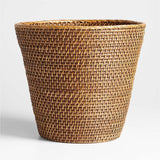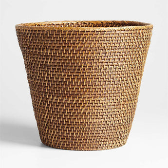 Tapered wastebasket takes care of the trash with loads of texture, handwoven of sturdy rattan and finished in a warm honey brown.