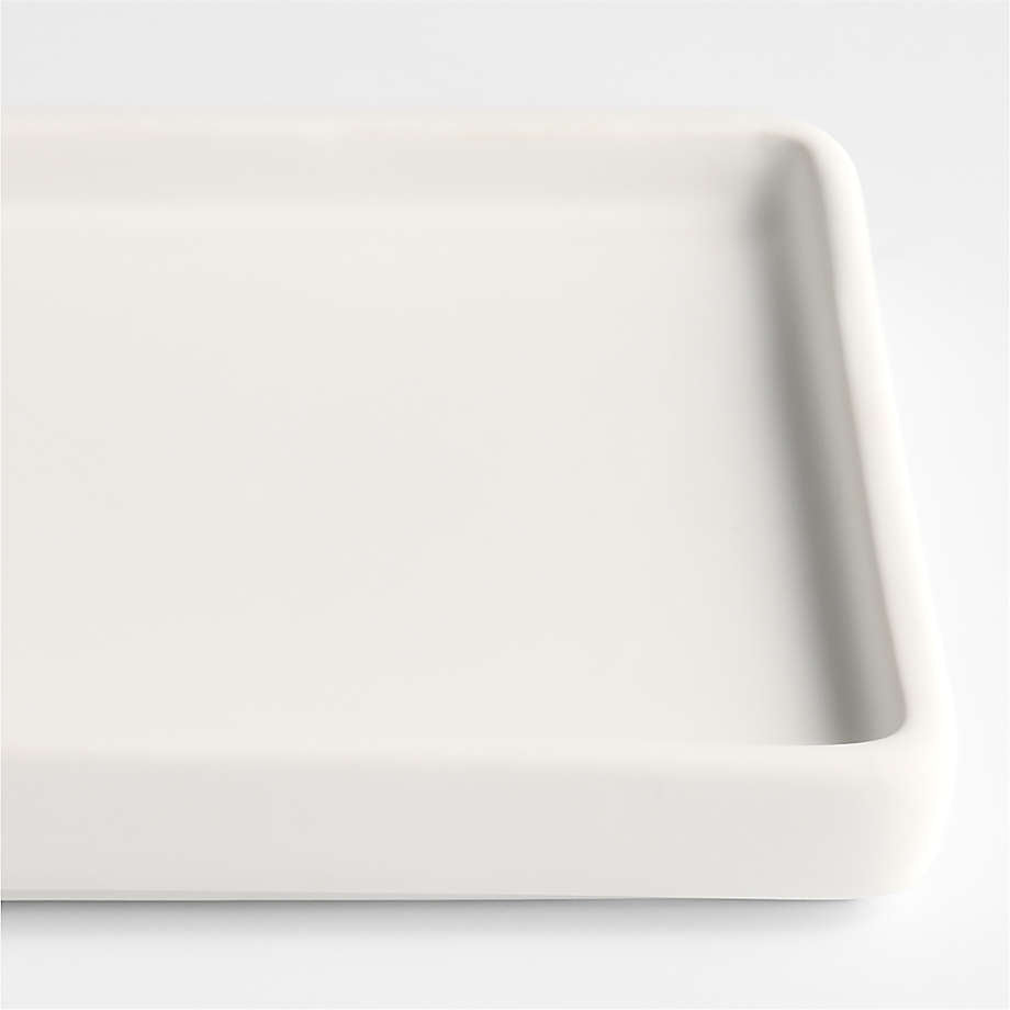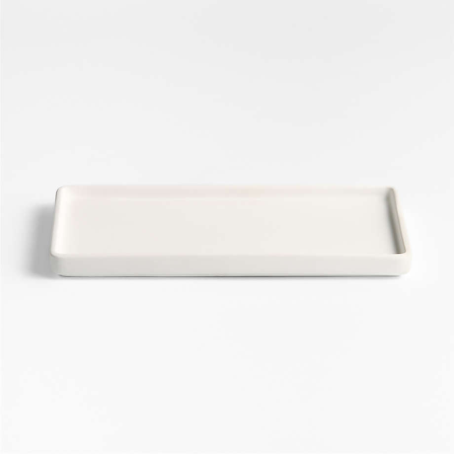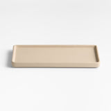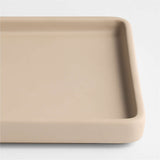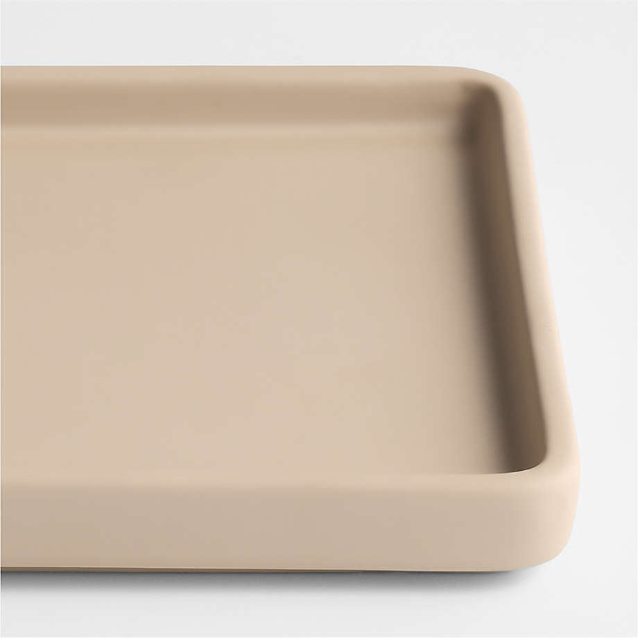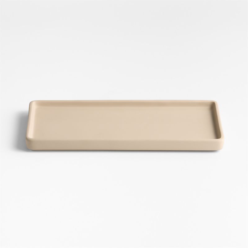 Our Varick bathroom collection dips sturdy ceramic in soft-touch, sand-hued silicone that feels soft and luxurious. The gentle, minimalist curves and compact scale suit even the smallest powder room, guest bath or en suite. Subtly tinted in a muted caramel color that's warm yet modern, this vanity tray corrals scent bottles and jewelry or the matching soap pump, tumbler and canister. Outfit bathrooms in all of our Varick accessories to create serene sanctuaries that are ready for company.