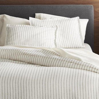 Crisp stripes on warm white linen chambray build a bed with classic pattern and luxurious softness. Woven of 100% linen, the soft duvet naturally regulates temperature, keeping you cool in warm weather and warm in cooler months. Duvet is edged with a one-inch flange and features inner corner ties to keep insert in place.