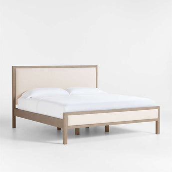 Keane streamlines a classic, modern bed in beautiful mahogany and meranti wood with a natural weathered finish. Cushioned panels on the head- and footboard are upholstered in a light, neutral fabric for a soft look and feel. Part of our best-selling Keane collection, the bed is designed to complement a variety of bedroom decor thanks to its clean architectural lines and casual attitude.