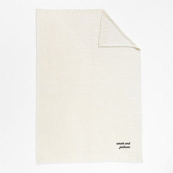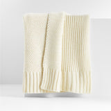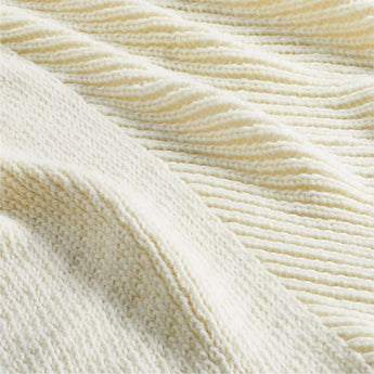 A trio of knitting stitches unite in a throw blanket with a wealth of texture and coziness. Durable, heathered yarn in creamy white creates an organic look with depth. Evoking the cuffs of a favorite sweater, the wide-ribbed border finishes the throw with a graphic striped pattern. Drape our exclusive off-white sweater knit throw blanket over the arm of a sofa or the foot of the bed so indulgent warmth and comfort is always right at hand.