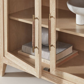 We've translated the refined elegance of our popular Clairemont accent tables into a storage collection made of beautifully grained oak. Standing on tapered legs, the clean-lined bookcase features neat mitered corners and recessed panels on the top and sides. Open shelves top a glass-paned cabinet in a versatile combination of open and closed storage. Brass-finished pull handles with distressed leather wrapping provide access along with a mix-material grace note.