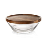 Table-ready and lovely to look at, this glass bowl gets a protective cover from gorgeous acacia wood. An excellent choice for the table, buffet or potluck offering.