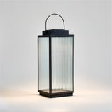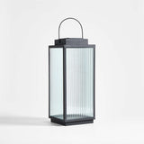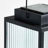 Illuminate your patio, porch or balcony with this lantern inspired by our bestselling Alfresco outdoor furniture collection. Framed in matte black, panels of linear ribbed glass soften the glow of the integrated lights. The look is fresh and modern, and the solar-powered battery means effortless operation. This medium LED lantern is perfectly sized for placing atop an outdoor coffee table or flanking a doorway.Powdercoated steel frame
