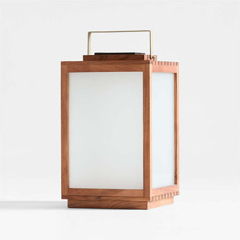 Set your porch or patio aglow with this lantern inspired by our bestselling Batten outdoor furniture collection. Framed in gorgeously grained acacia wood with Batten's signature slat structure, the frosted glass panels give off a warm, inviting glow. The solar-powered battery means effortless operation, and the taupe-finished handle makes it easy to tote about. This medium LED lantern is just the right size for flanking a doorway or illuminating an outdoor coffee table.