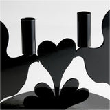 Birds and hearts were beloved motifs that Lucia Eames returned to throughout her career. Our sculptural candelabra nods to the artist's metal works, bringing together two of her fancifully feathered bird silhouettes as they touch their beaks on either side of a heart-sprouting flower. Made of black-finished sheet iron that's laser cut, welded and hand finished, the candle holder hosts a couple of taper candles (sold separately) for a striking mantel or dining table accent.