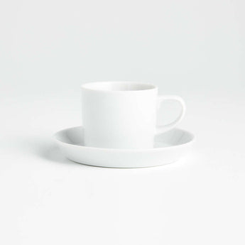 Clean, simple and beautifully balanced, espresso cup with saucer in white porcelain designed by Martin Hunt feature flared rims and straight sides is the ideal blank canvas for your culinary creations. Also available in a set of eight espresso cups with saucers.