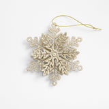 Our Christmas tree ornament captures the intricate geometry of a perfect snowflake with a dimensional design that sparkles with gold glitter.