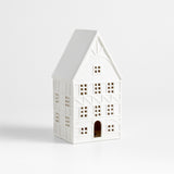 When filled with glowing tealights, this tall townhouse with cutout windows creates the inviting look of a light-filled Tudor home. The snow white-glazed ceramic home boasts a clean, minimalist style that suits modern holiday decor. Combine with our other architectural styles to create a cozy winter village on your mantel, buffet or dining room table. A Crate & Barrel holiday exclusive, each collectable ceramic house is debossed on the back with its architectural style and the year 2024.