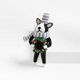 Capture the playful spirit of the season with this meticulously crafted felted wool dog, adorned with a festive wreath and knitted gray-and-white striped scarf and hat. Hung on a Christmas tree or adorning a wrapped gift, the ornament's soft felted wool texture and cheerful design are sure to bring a smile to everyone's face.