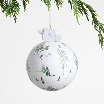 Every time you peek at our winter scene Christmas ball ornament, you'll discover a different handpainted vignette. From skiers to sledders to pups living their best winter life, each one captures the essence of a snowy holiday. Our favorite element of this Crate & Barrel exclusive is the unique decorative car carrying home a freshly cut Christmas tree perched at the top, replacing the usual hook.