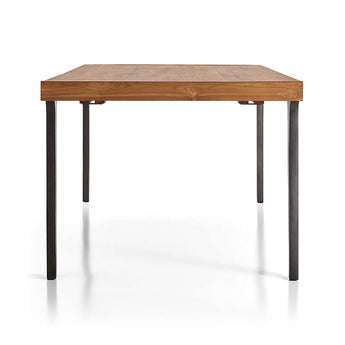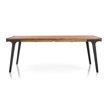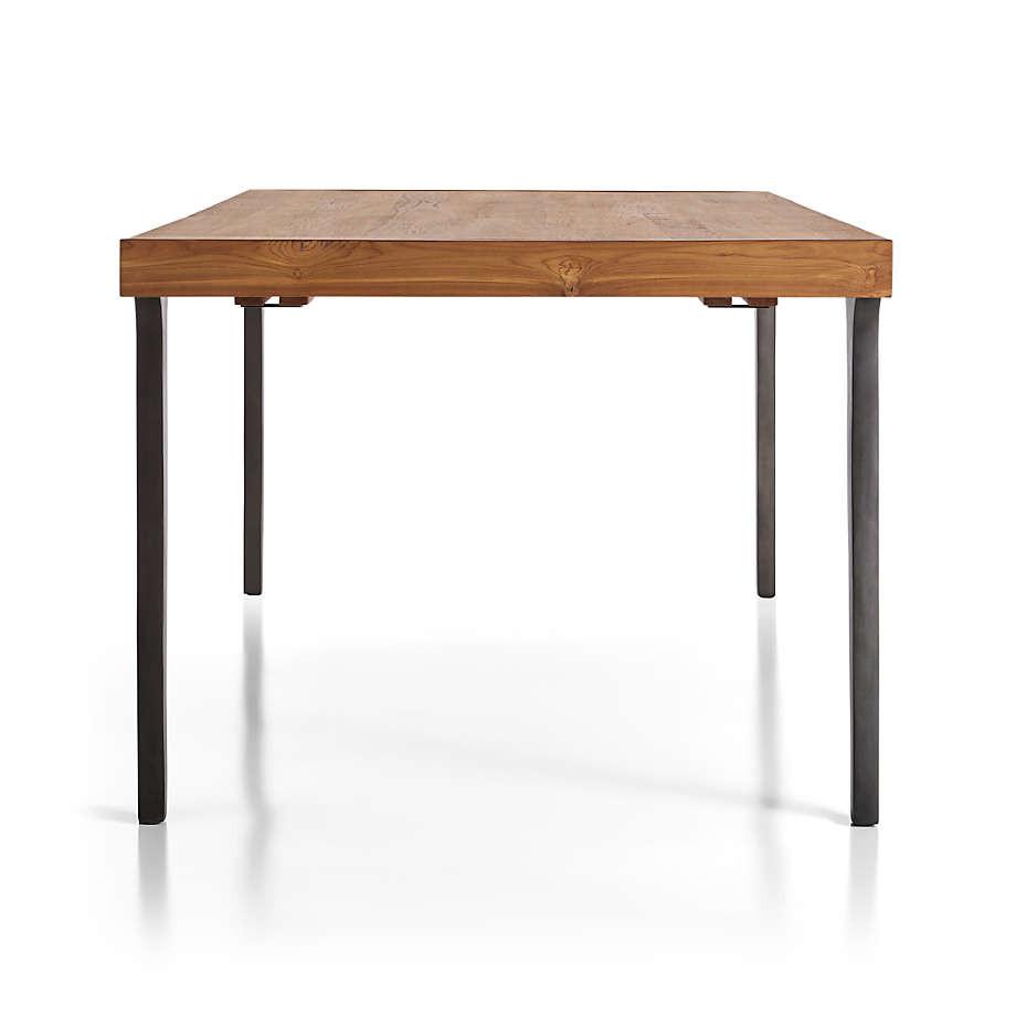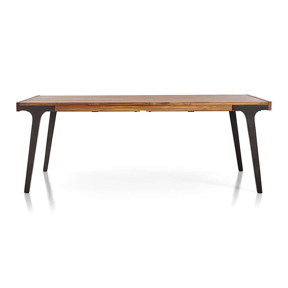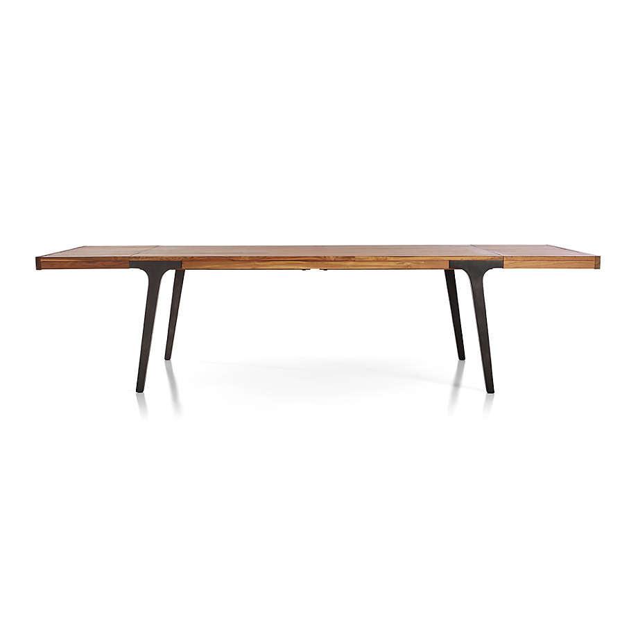 Interpret it as farmhouse forward or mixed-material moderneither way, Lakin expanding dining table strikes a sophisticated balance between wood and metal. A refined frame in repurposed teak is topped with hand-selected boards that are sanded, buffed and waxed to a warm glow. ^ Antiqued to get the look of cast iron, Lakin's metal legs seamlessly integrate with the table's wood apron, angling out for maximum style and legroom. Expandable table features two leaves that expand the table to seat extra guests. The Lakin Extendable Dining Table is a Crate and Barrel exclusive.