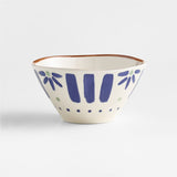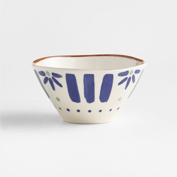 Our Taormina outdoor dinnerware emulates the casual look and breezy feel of handcrafted Mediterranean ceramics. Made of lightweight and durable melamine, the organically shaped bowl looks as if it were formed out of terracotta, glazed shiny white and handpainted with daubs and dashes of aqua and navy in a motif inspired by traditional tiles.
