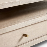 Given a neutral driftwood finish, Keane complements any decor with clean lines and the organic beauty of natural wood. Channel detailing lends eye-catching dimension and linear interest to the coffee table's architectural lines. A generously sized open shelf provides space to stow magazines, books or trays, while four drawers punctuated by brass-finished pulls offer closed storage for remotes, coasters and other living room sundries. Our best-selling Keane collection is a Crate & Barrel exclusive.