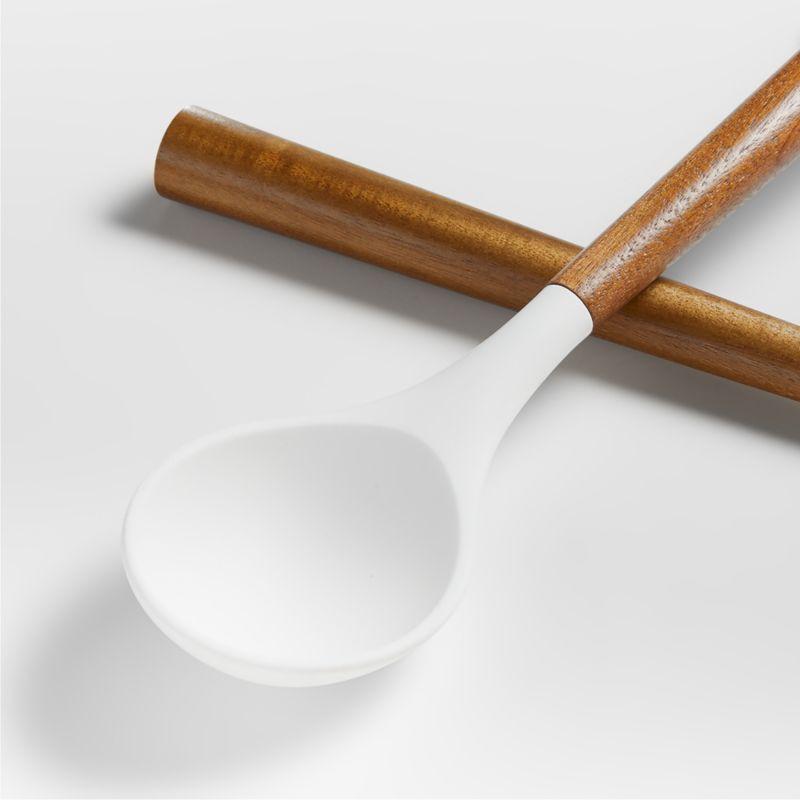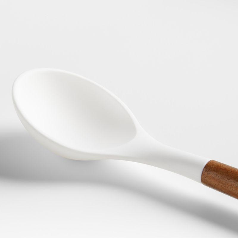 Designed with a white silicone head and a rounded handle of solid acacia, this modern slotted spoon is ideal for all prep, cooking and serving tasks. A joy to use, the spoon's silicone head won't scratch pots and pans and is heat- and stick-resistant. For a well-coordinated kitchen, team the silicone slotted spoon up with matching utensils in this exclusive collection.