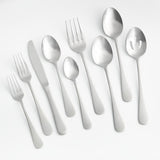 The classics will never go out of style. Traditional European design makes this flatware perfect for every day, every occasion. Stamped stainless steel utensils with a mirror finish have pleasing curves and a timeless aesthetic, and are dishwasher-safe for easy cleaning after weekday meals and festive gatherings. Each of the eight 5-piece place settings consists of a dinner fork, salad fork, dinner spoon, teaspoon and dinner knife. This set also includes eight extra teaspoons, two serving spoons, slotted serving spoon and serving fork.