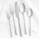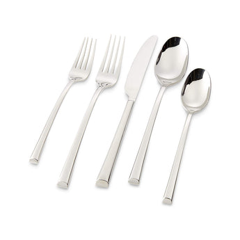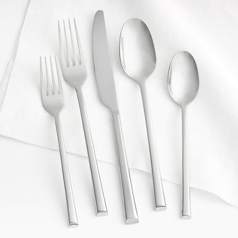 The long, slender handles of our Cortland flatware arch gently to squared-off ends. A mirror finish balances their modern, streamlined forms for a set that suits tables both casual and formal. The five-piece place setting includes a dinner fork, salad fork, dinner spoon, teaspoon and dinner knife.