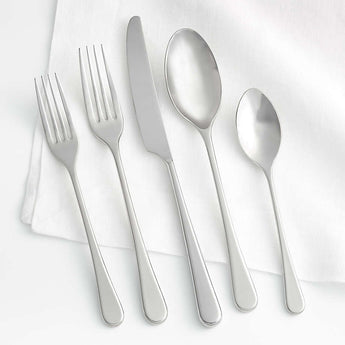 Fashionably svelte and highly polished. The slender, flowing shapes of our Tour flatware are stamped and forged in stainless steel and mirror-finished for added sparkle. This five-piece place setting includes a salad fork, dinner fork, dinner knife, dinner spoon and tea spoon. Designed by Robert Welch exclusively for Crate and Barrel, this set pairs perfectly with our Tour serving pieces.