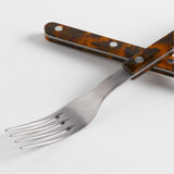 Inspired by well-loved bistro flatware, this five-piece place setting brings French cafe style to your table. Stunning tortoiseshell sandwich streamlined stainless steel heads that have been given a vintage finish, secured with visible rivets. The result is a modern take on retro flatware simple and liveable with a touch of edge.