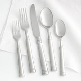 Shining and stylish, with a handsome banded cuff and tip. Classic yet contemporary, this weighty, versatile flatware features generous handles and a gleaming mirror finish.