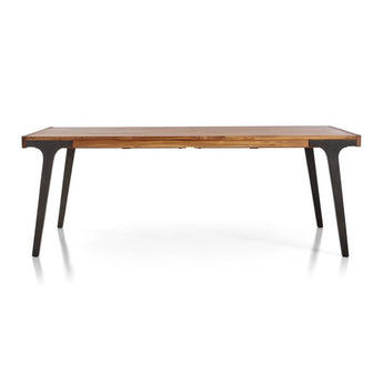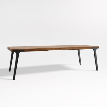 Interpret it as farmhouse forward or mixed-material modern. Either way, our Lakin expanding dining table strikes a sophisticated balance between wood and metal. A refined frame in repurposed teak is topped with hand-selected boards that are sanded, buffed and waxed to a warm glow. Antiqued to get the look of cast iron, Lakin's metal legs seamlessly integrate with the table's wood apron, angling out for maximum style and legroom. The extension table features two leaves that expand seating from 10 to 14 guests. The Lakin Extendable Dining Table is a Crate & Barrel exclusive.