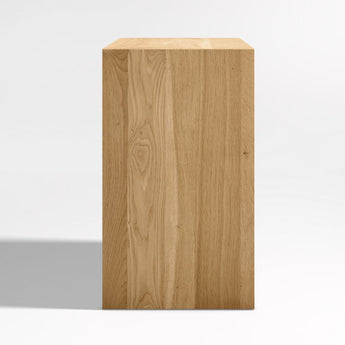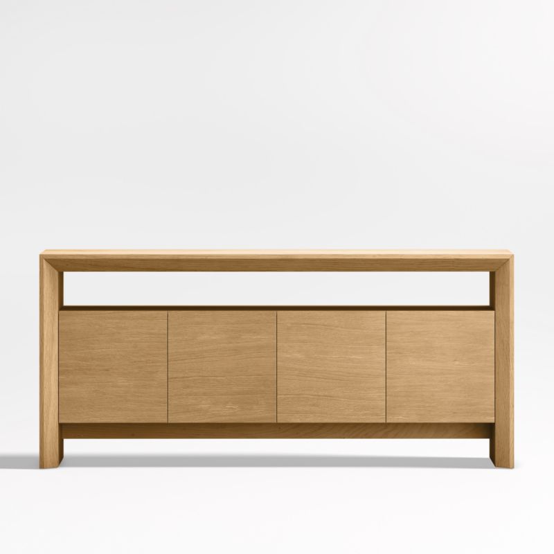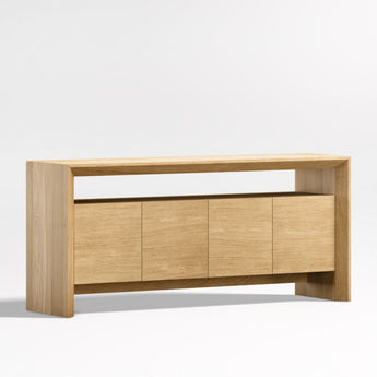Named after the natural beauty found in the Baja Peninsula, our media console celebrates the organic richness of solid oak. Simple geometry and a natural stain put the focus on the wood's unique grain, knots and markings. Reverse chamfer edges and an open shelf lighten the clean waterfall silhouette, floating a pair of flat-fronted cabinets. Rustic and timeless, the Baja natural oak media console is a Crate & Barrel exclusive.