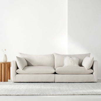 It's time to Unwind with our coastal-cool slipcovered sofa. Named after our favorite thing to do, this modern beauty delivers relaxing proportions and sumptuous sink-in cushions. The roomy sofa features slim arms and a low deck that makes room for pillowy back and seat cushions for an exceptionally deep, comfortable sit. We love the natural feel and slubby texture of the slipcovers, made of a breezy blend of cotton, linen and viscose yarns.