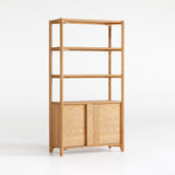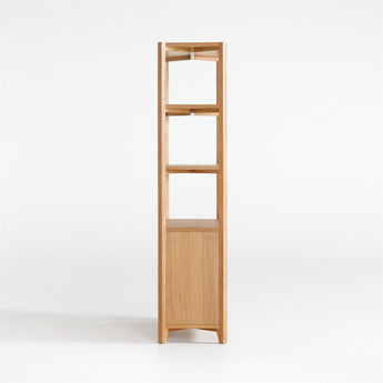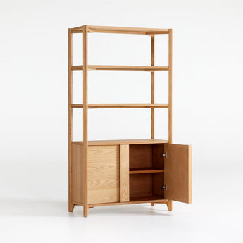 Vertex's converging angles make a dynamic play of oak's beautiful cathedral grain. An integral element to the bookcase's animated design, the wood grain reverses direction on the three fixed shelves and cabinet doors with bold, integrated pulls. Outfitted with an adjustable interior shelf, the cabinet provides storage for books, board games or office supplies. The Vertex bookcase is a Crate and Barrel exclusive.