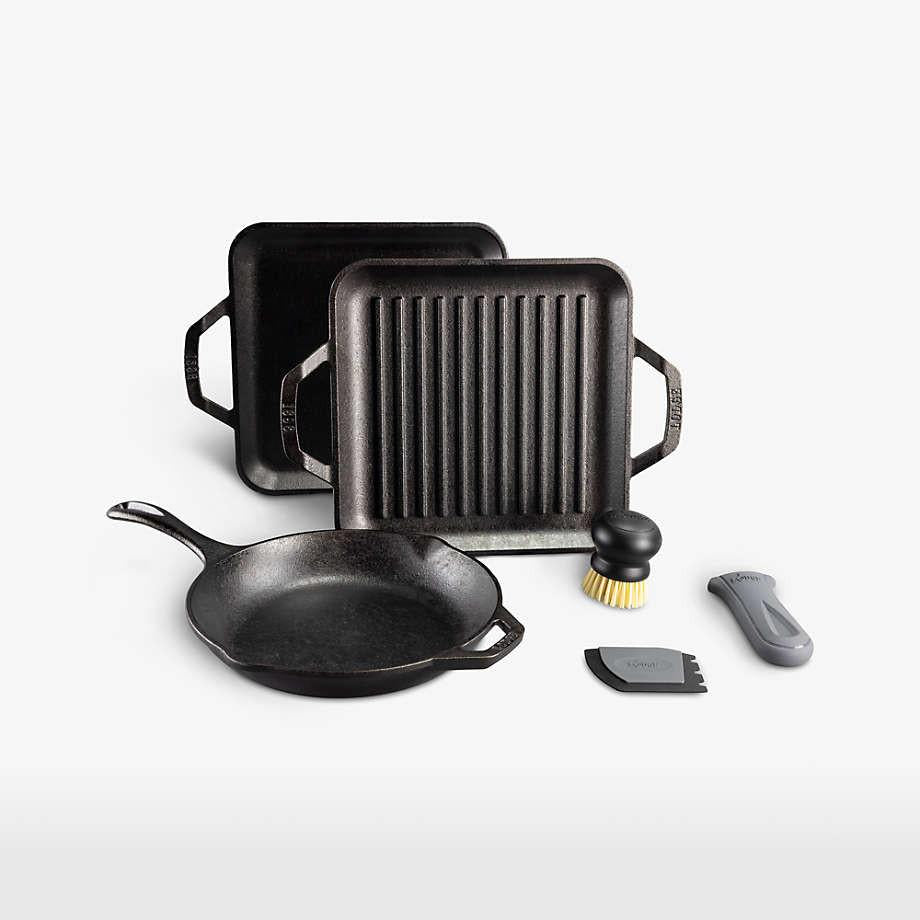 - Set includes 10" skillet, 11" square griddle, 11" square grill pan, deluxe hot handle holder, deluxe scraper and round scrub brush