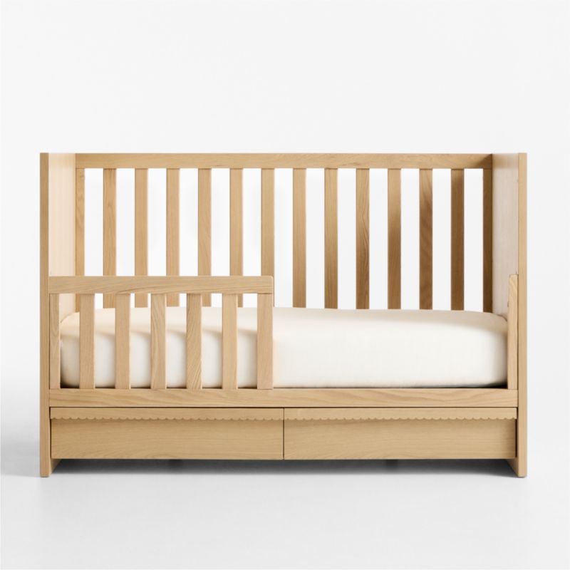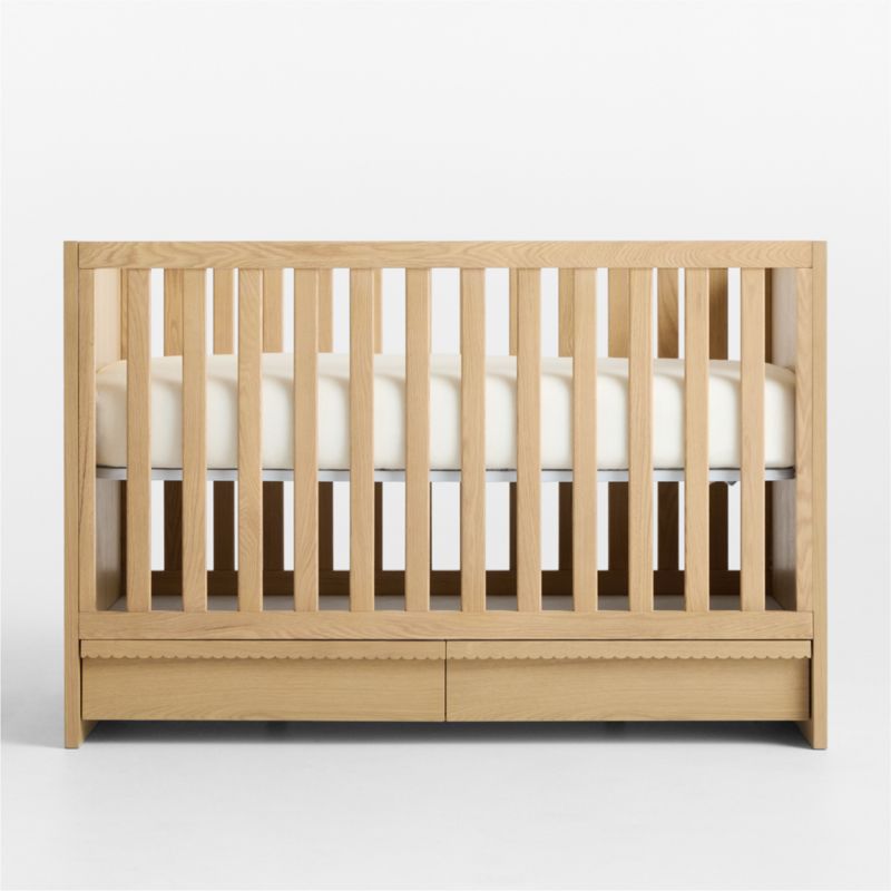 Our Raya crib combines a modern silhouette with major curve appeal. Mini scallops along the trim lend a playful edge to the piece's clean lines and warm wood finish. Two large drawers at the base sneak in extra storage (always appreciated in a nursery). Made from high-quality, FSC®-certified oak with an included rail for converting to a toddler bed, it's an heirloom-quality piece designed to last beautifully through the yearsand maybe even get passed down to the next generation. Pair it with the Raya armoire for a coordinated look.