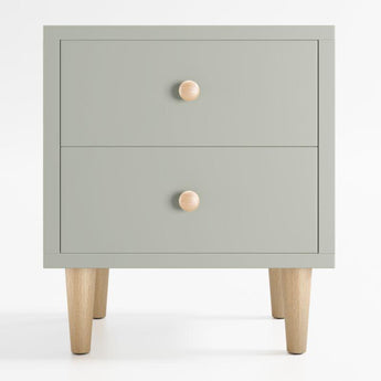 Clean lines, elevated paneling and an on-trend sage hue: Count us in! Largely inspired by Scandinavian farmhouse design, our Finn kid's furniture collection blends rustic charm and modern minimalism without skipping a beat. Detailed with legs and knobs in a natural finish, the mix of earthy tones creates a calming vibe that translates perfectly in a nursery but can easily grow into big kid-approved styles. Two roomy drawers keep nighttime essentials at the ready or bulky items out of sight.