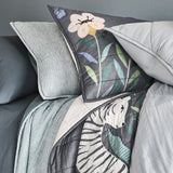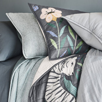 Two big cats stalk gracefully amidst oversized plant life on our Marrakech Tiger Quilt. Flowers and foliage in richly hued jewel tones grow lushly against the rich navy background. Highlighted with embroidery, the textured bedspread is hand-stitched by talented artisans. The lightweight cotton voile layer is perfect for young adventurers and cleans up easily in the washing machine. To complete the look, add the other bedding in our exclusive Marrakech Tiger collection.