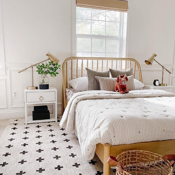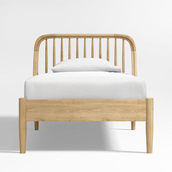 Our Bodie Oak Spindle Bed is timeless kids furniture with a right-now twist. From the subtle curves of the headboard to the slightly angled back legs, this design gives classic spindle bed styling a modern update. Crafted to last through the years and grow with your family, it features solid poplar slats for support and durability. The bed's gorgeous natural grain will be perfectly at home in your kid's room, while a generously sized headboard gives little ones and grownups enough room for story time.