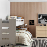 We've created a Loft Bed with more space saving capabilities than ever before. With a smaller profile than a usual loft bed, this twin loft bed saves you more floor space than ever before. Not only that, the unique incorporated ladder on the left side makes it even more compact. Plus, the white glaze finish allows the wood's natural grain to show, letting it coordinate with nearly any décor. Pair it with our exclusive Abridged Rolling Twin Bed and create an instant Bunk Bed.