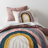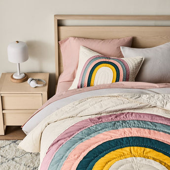 On your arc, get set, go! Our lightweight Asha organic cotton quilt is everything we love about rainbows (see: happy, hopeful and energizing) but reimagined with modern-goes-boho vibes. The five exaggerated arches are colored in with softer-than-usual hues and finished with embroidery that follows the rainbow's swooping design. It's kinda like this bedding is ROYGBIV's cool and trendy cousin.