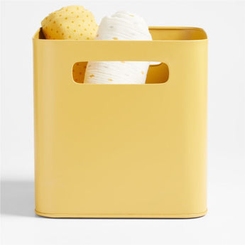 Contain anything and everything with our simple, stylish Outline metal storage bin. Designed for versatility and built to handle years of use, the ocher yellow-finished iron bin is deep enough to keep books upright, craft supplies organized or study essentials always where you need them. The fun color and rounded edges look great and slide into a bookshelf cubby or kids desk. Cutout handles on each end are easy for little hands to grip. Ideal for video game storage, this bin also pairs with the coordinating Outline metal desk organizer and shelf for a study zone dream team.